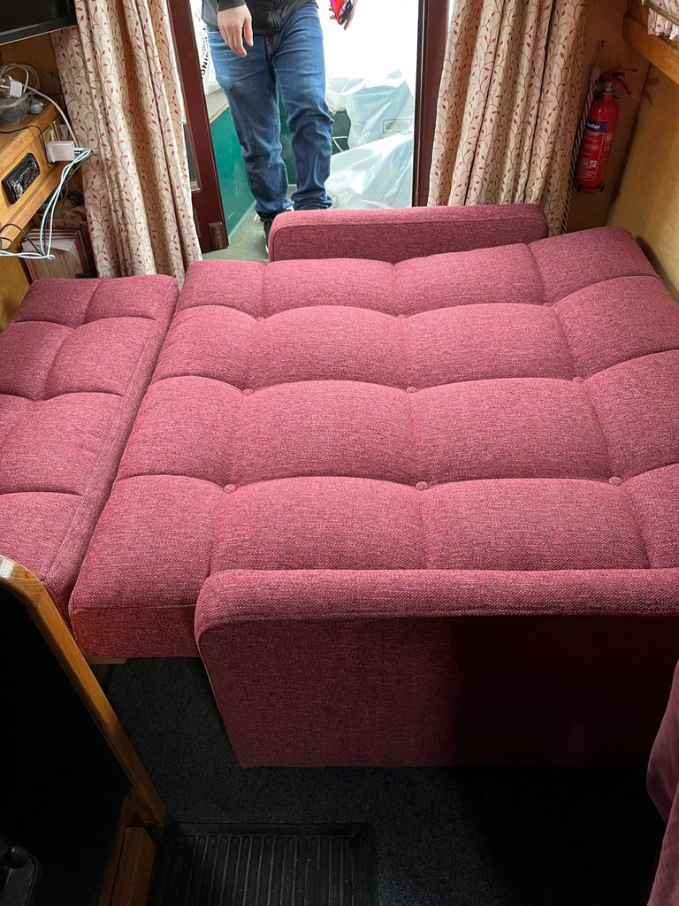 Moving further towards the bow is the dinette; with removable, extending full size table (for 6 people) or alternative half size table (for 2) The dinette extends to a double bed (new mattress cushions 2025) and incorporates a wardrobe, storage space under, and a the freezer.