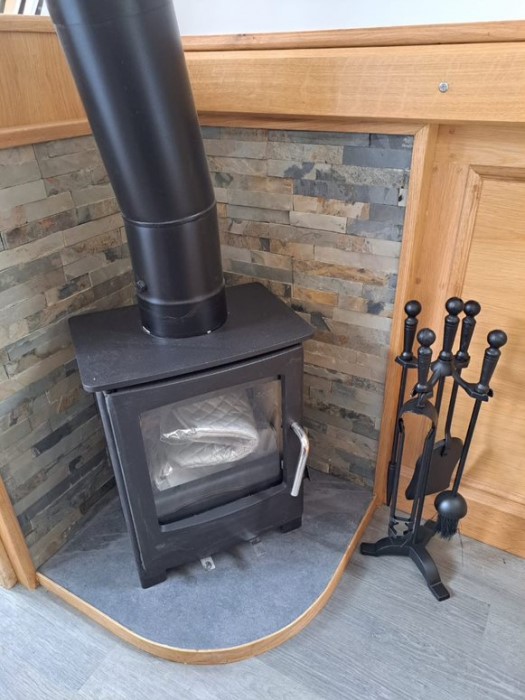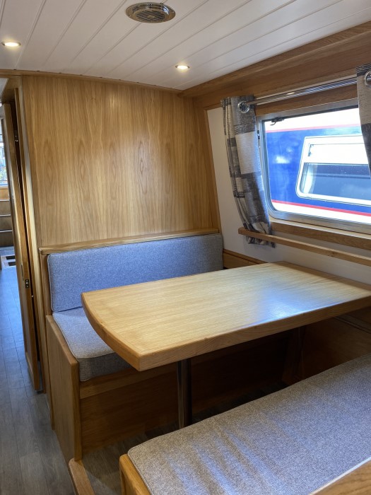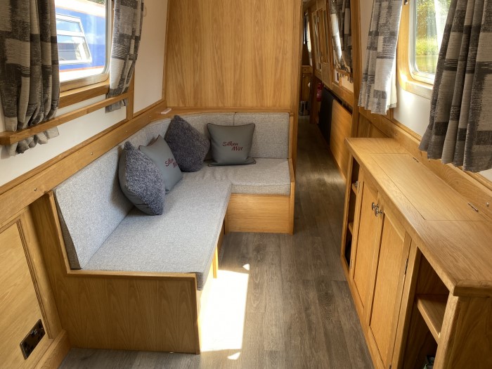 Diesel Webasto 5kW heating to radiators throughout plus Morso solid fuel stove alongside L-shaped seating area (converts to double bed) with removeable dining table and TV cabinet enclosing Samsung smart TV on lift mechanism and WiFi router.