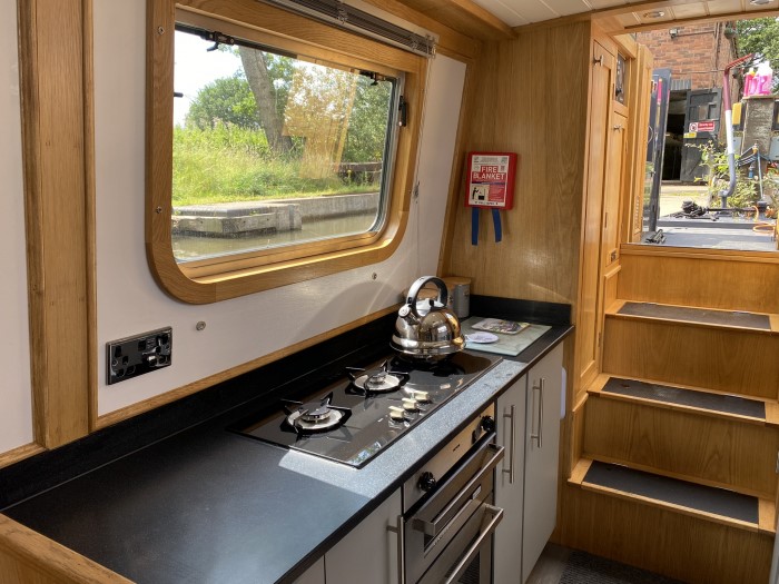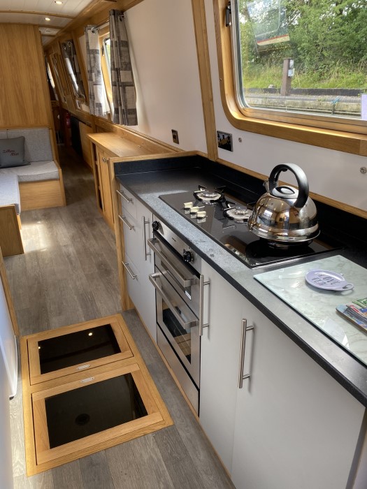 Down stairs into fully fitted galley with microwave and calorifier to one side and electrics cupboard to the other, including 2500W inverter. and battery monitor for rooftop solar panels. Fitted kitchen including fridge / freezer, LPG cooker & hob and under floor lighted wine rack with glass top. Fully stocked cooking & dining inventory.
